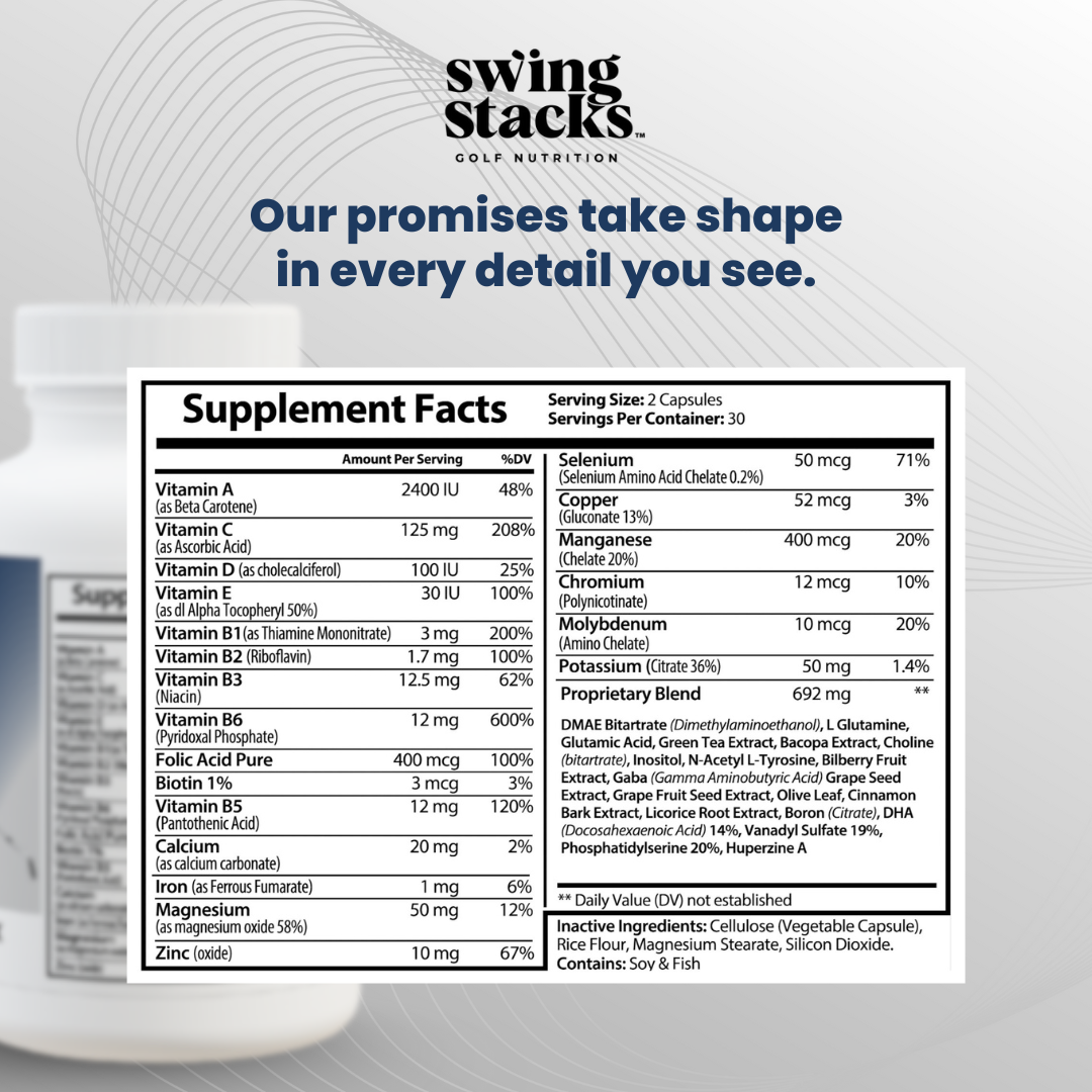 Swing Stacks™ supplements are capsuled in the USA with globally sourced ingredients at FDA-registered, GMP-certified facilities and undergo third-party laboratory testing to ensure purity and potency.