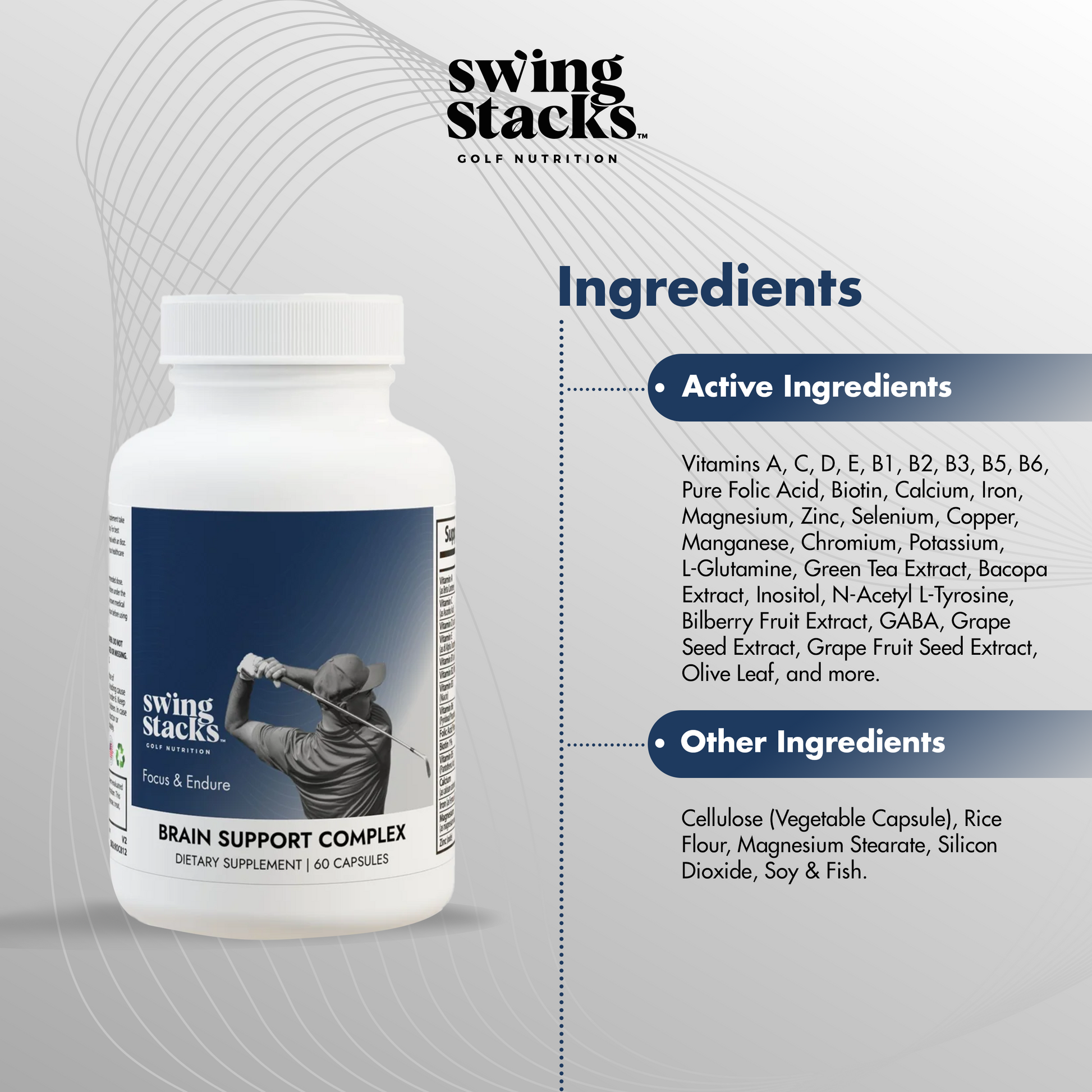 Golf is a game of mental sharpness and physical stamina—and Focus & Endure is designed to support both. This comprehensive brain support complex is formulated with a potent blend of vitamins, minerals, antioxidants, and herbal extracts to enhance cognitive function, muscle recovery, and exercise performance. Whether you need sharper focus on the course or improved endurance for demanding workouts, Focus & Endure delivers the essential nutrients your mind and body need to excel.