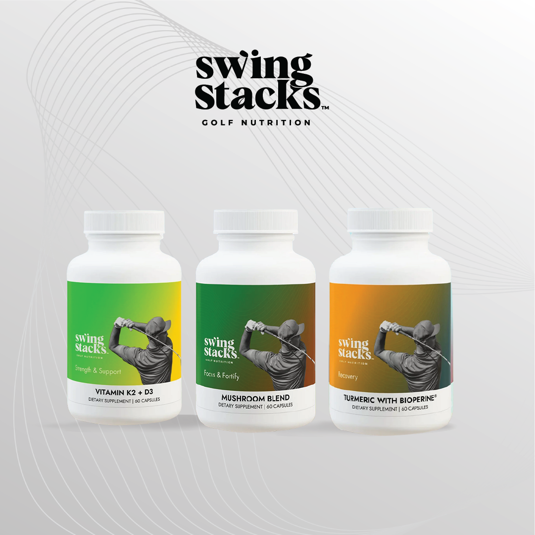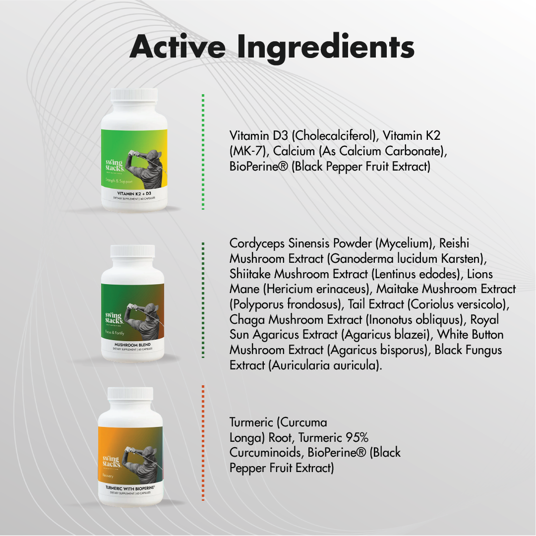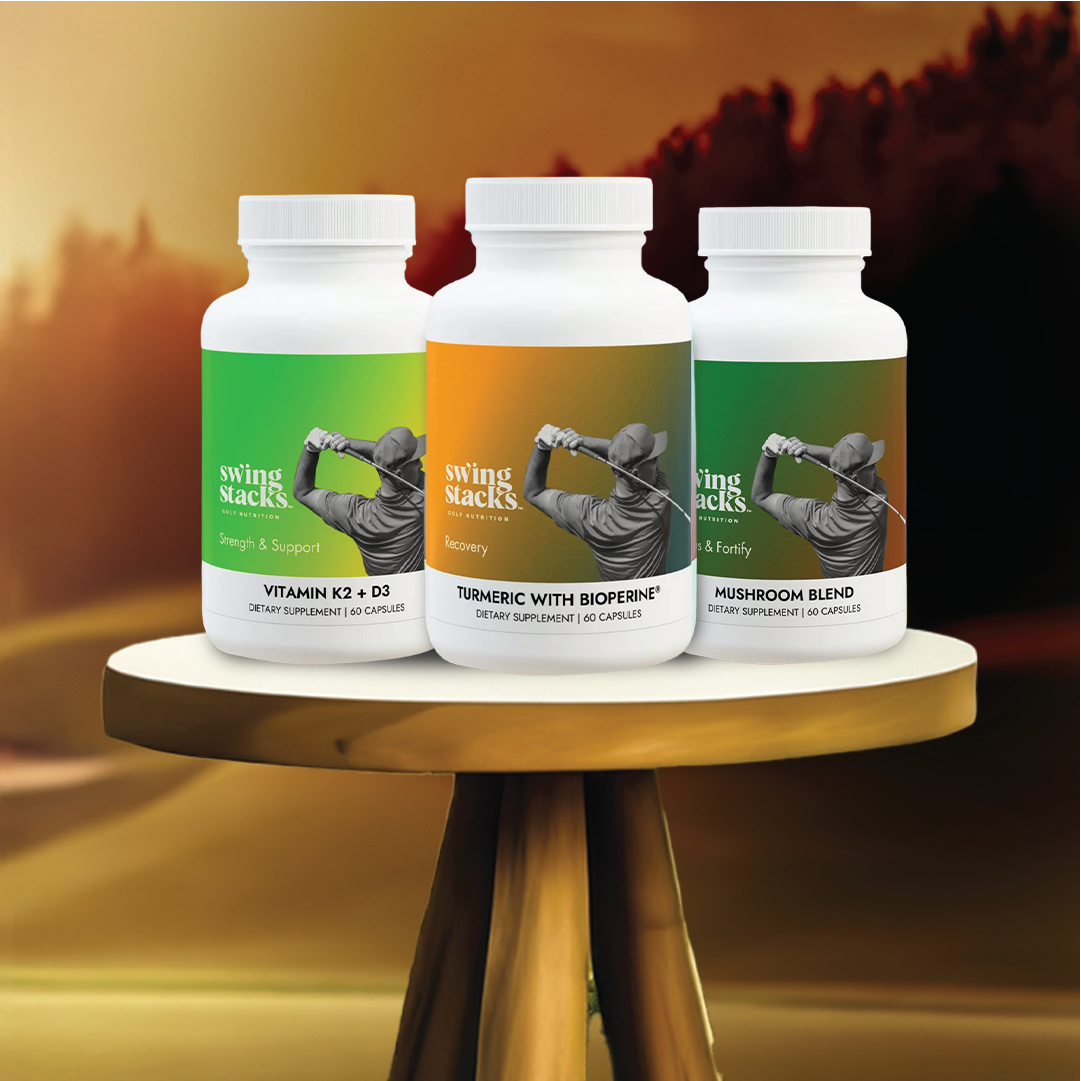 For the seasoned golfer who plans to stay sharp, strong, and injury-free for years to come. You’re not just playing the game—you’re mastering it, and this stack helps keep you on the course for decades to come. What’s Inside: Vitamin K2 + D3 – Supports muscle mass, bone strength, and overall wellness so you can keep walking the fairways. Turmeric & BioPerine – Helps ease soreness and speed recovery after a long round (or a doubleheader). Advanced Mushroom Blend – Enhances mental clarity, focus, and immunity, keeping your game sharp on and off the course.