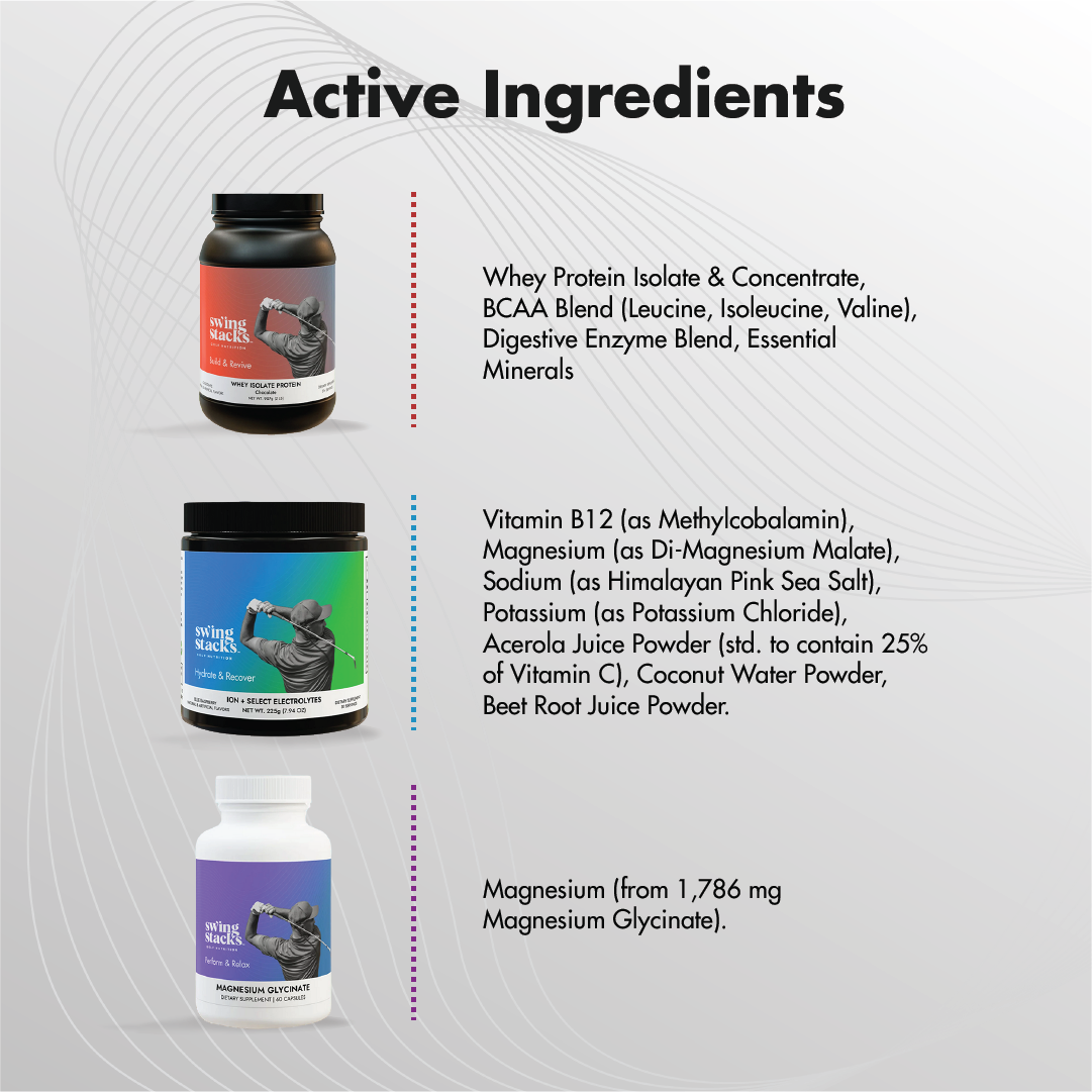 For the golfer who’s first on the tee box and last to leave the range. Whether you’re walking 18, grinding on the range, or squeezing in your third scramble of the week, this stack is built to keep you going—round after round. What’s Inside: Magnesium Glycinate – Supports muscle recovery and restful sleep, so you’re ready to go at sunrise. ION + Electrolytes – Keeps you hydrated and energized, perfect for repeat performances. Whey Protein – Helps build lean muscle and prevent breakdown, keeping your swing strong.